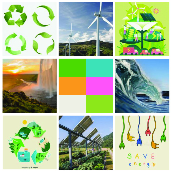 There is a mixture of illustrations, pictures of nature and pictures of renewable energy sources within this mood board.