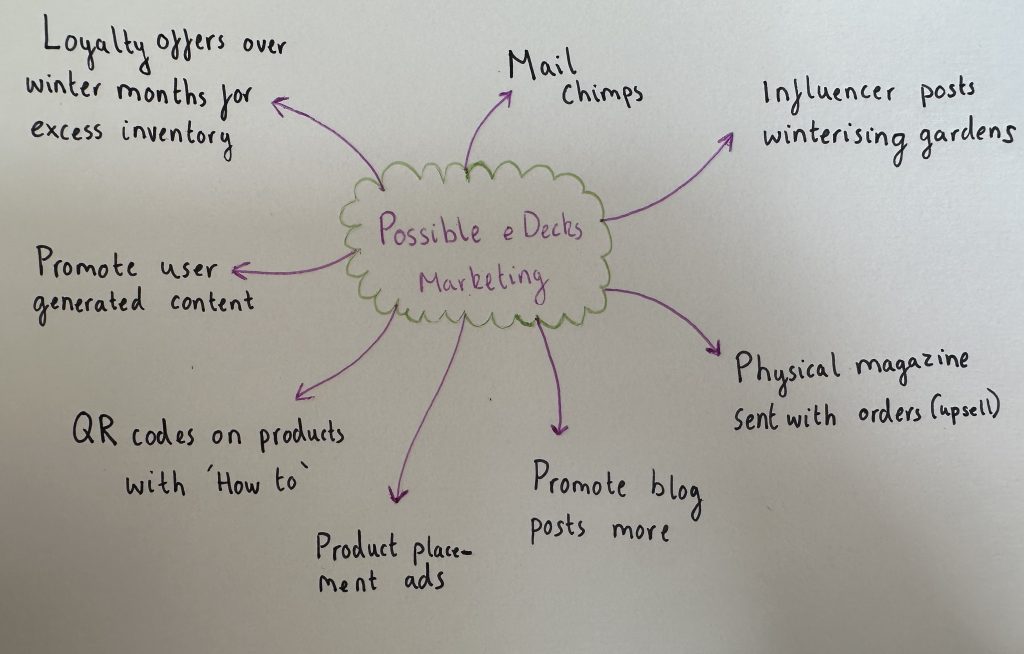 This research led to the discussion of whether eDecks should broaden their product range to include products that can be promoted at Christmas. Such as outdoor Christmas lights and decorations or kits to make the garden look festive for families.