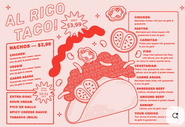 Creative Market (2025) Mexican food menu. https://uk.pinterest.com/pin/68748767707/sent/?invite_code=5820575b059e4ac585b4d6c99d33621f&sender=585116313995717227&sfo=1 [Accessed 12 May 2025].