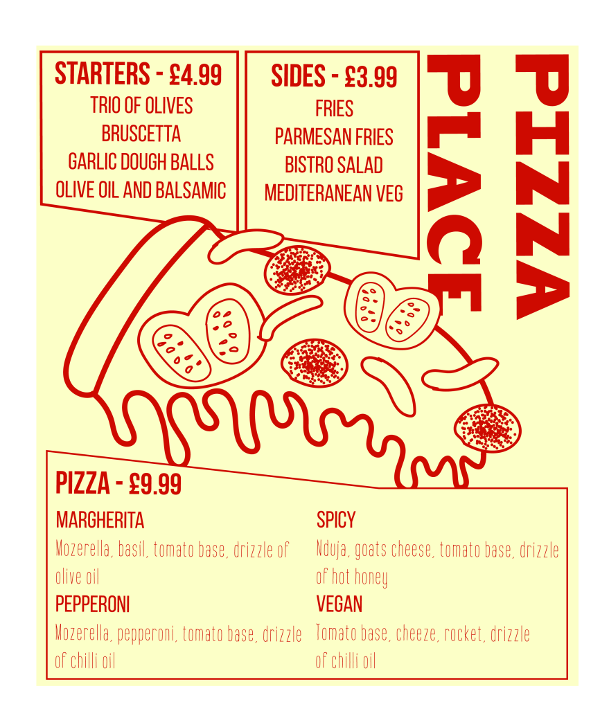When looking for menu ideas I felt inspired by the below menu, I then created a Pizza Place branded version using Adobe Illustrator and a Wacom Tablet.