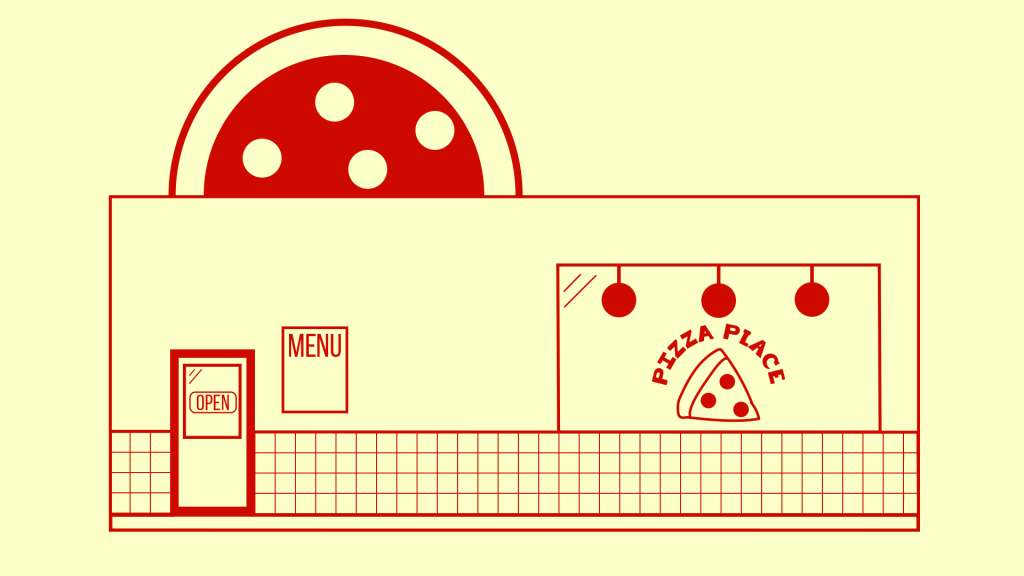 This style of illustration matches the creative, modern and fun brand identity of Pizza Place and connects well with the target audience. The record shop sparked the idea of having half a pizza on the building to stand out from other pizza restaurants in Hull and to communicate with passers by the type of venue.