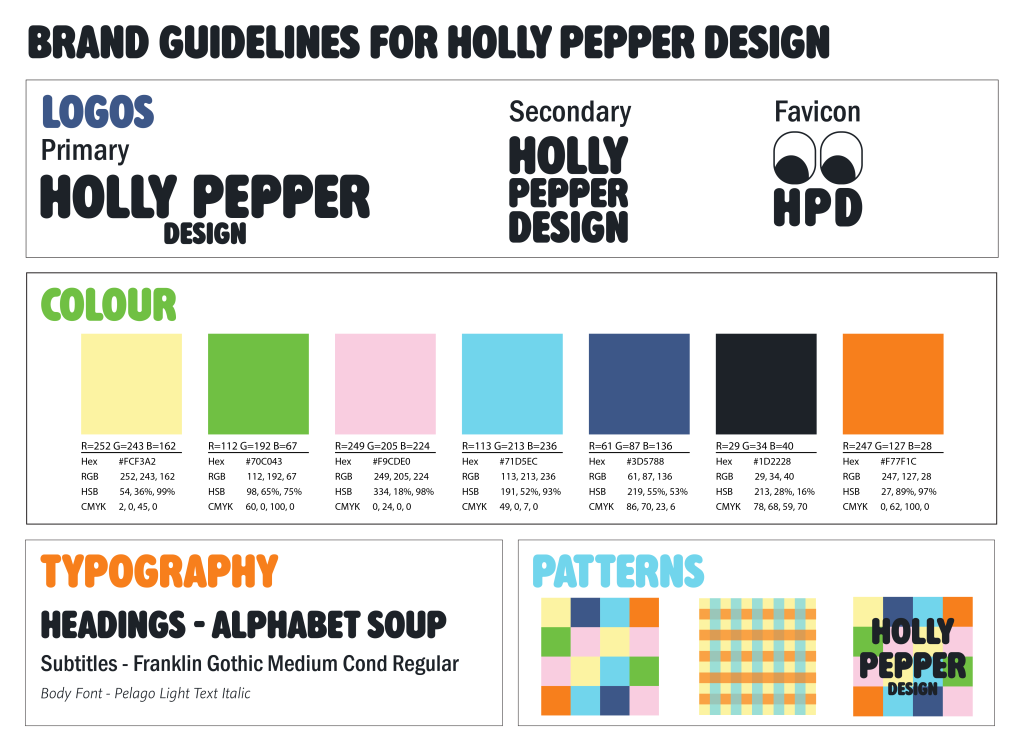 The typeface chosen and logo designed to represent Holly Pepper Design depicts the cheerful, imaginative, spirited, illustrative style that was mentioned in the word association, whilst also being bold and readable.