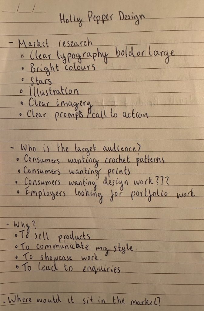 To start the design process, I explored what the purpose of Holly Pepper Design was, who the audience would be, what platforms may host the brand, selling products, word associations and more. Whilst my original proposal mentioned rebranding my crochet business, I thought to the future and what market I would like to move into. It felt important to delve into the potential of the business to understand what the tone the branding would need to be.