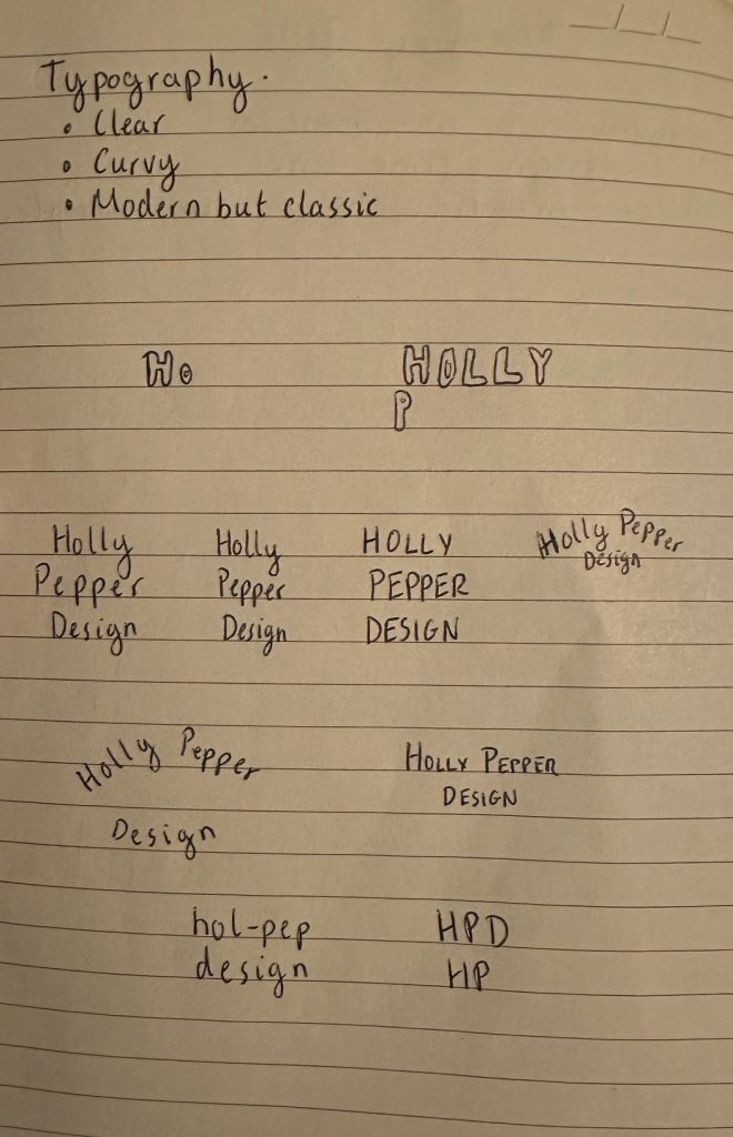 A main aspect of my plan was to create branding for my personal brand as a designer, Holly Pepper Design. To do this I delved into what current graphic designers and agencies have as their branding, keeping in mind that my aim was to be comparable but also to stand out. I noticed that a lot of the logos for the popular graphic designers and design agencies were purely typographical. May (2023) made an interesting point, when talking about the Wolff Olins fun rebrand, that many creative agencies are lacking creativity in their own branding. This inspired me to develop branding that wasn’t just a traditional font-based logo, I wanted to ensure creativity was included by using symbols or bespoke typography.