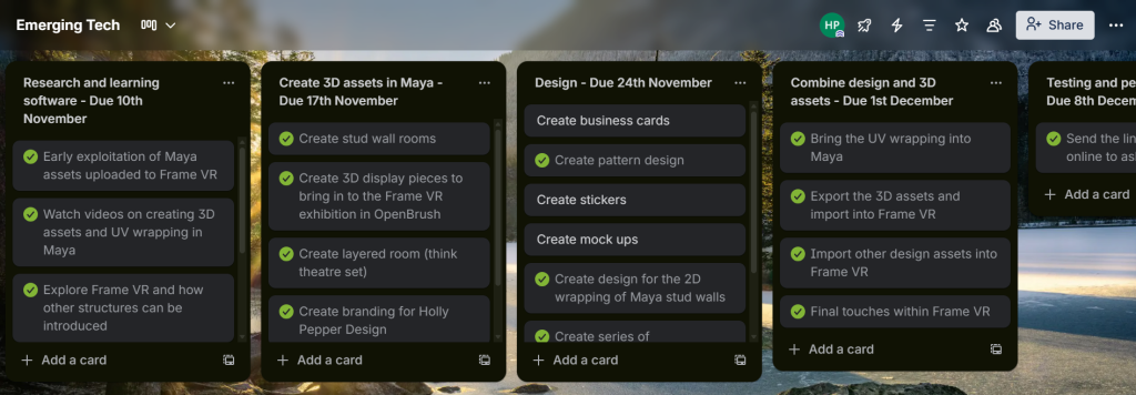 Using Trello allowed me to keep a track of this project and played a key part in ensuring every step was carried out. Within the Trello board I had included a check box for user feedback, which is a step I carried out, and this allowed me to gain valuable comments that improved the user experience (UX). An example of this was when developing my Frame VR environment, I had been solely focusing on the user interface (UI) of a desktop and the feedback received was about the layout for mobile phone interface. This allowed me to amend the space to make it compatible on both larger and smaller screens.