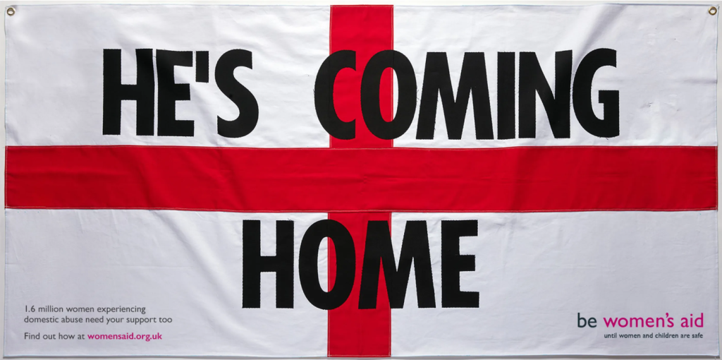 This design uses the St. George flag as a backdrop and a twist on the classic football chant/song ‘it’s coming home’ to communicate the message of domestic abuse against women. With shocking figures on the number of women that are abused and a video campaign that implies how this abuse increases during large football events, this simple design communicates a strong message, that the “women experiencing domestic abuse need your support too”.